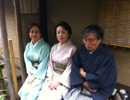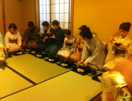 広間で床の間と点前の道具を拝見し、懐石のあとの和やかな様子。薄茶をいただきます。